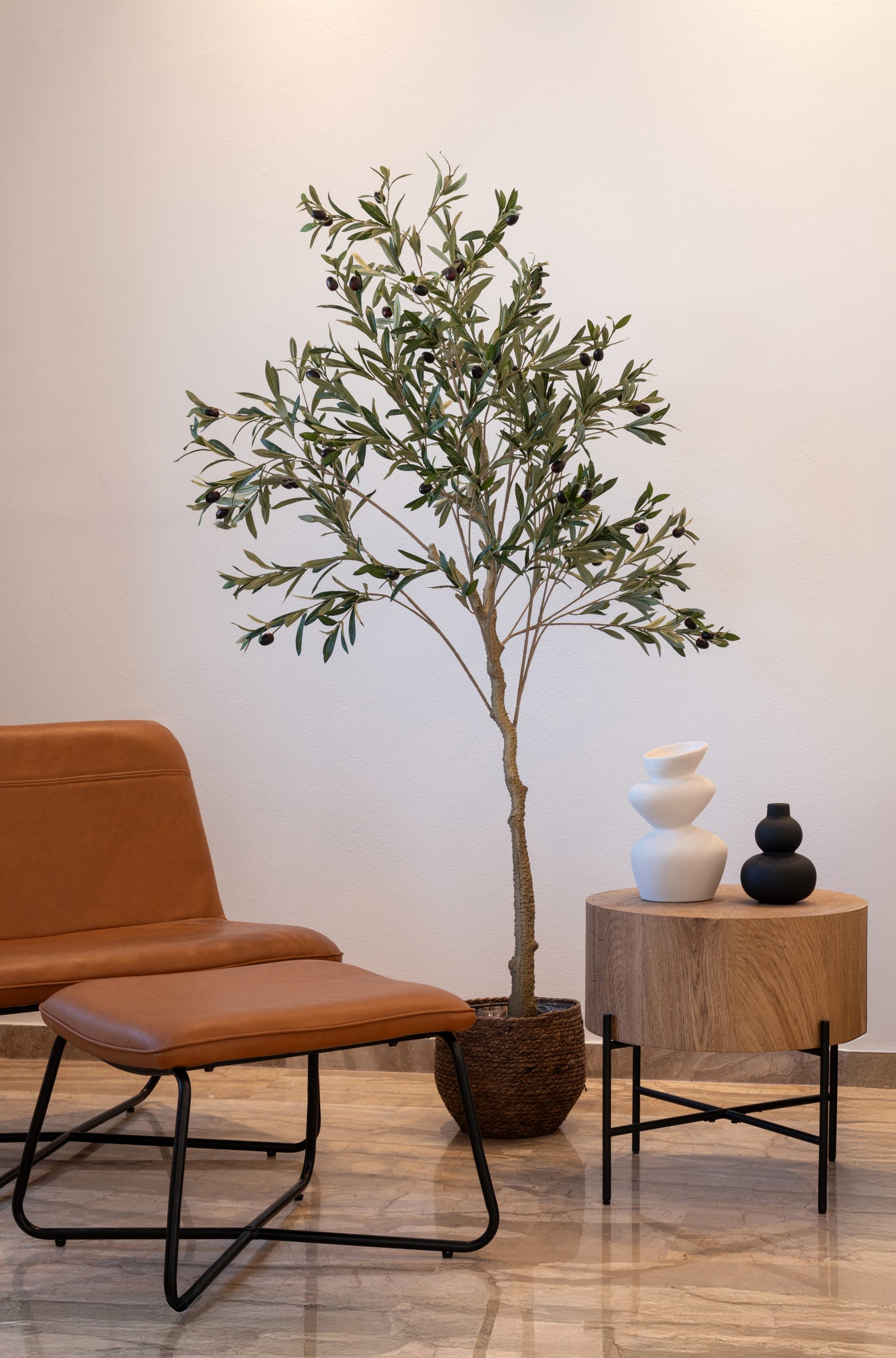 The space features warm, earthy tones and natural materials like wood and marble, creating a cozy and welcoming atmosphere.
