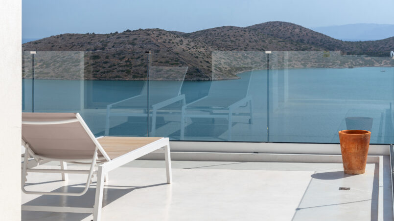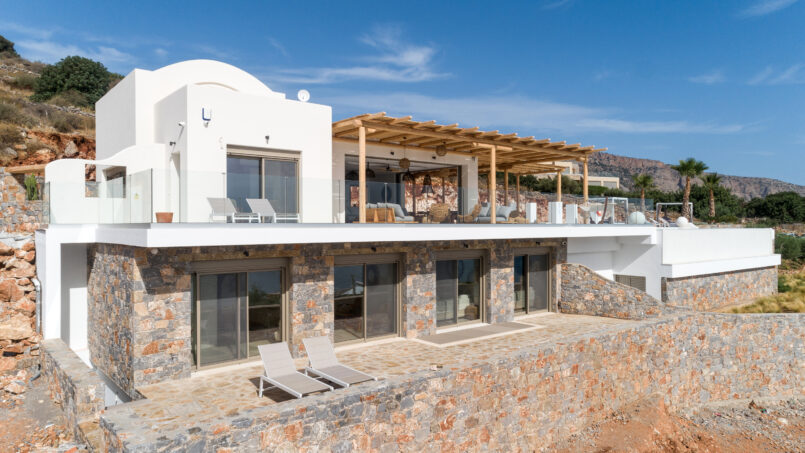 Serenity Art Villa is the latest in the art villa greece group completed in June 2022 . It offers unique 180-degree views of Elounda Bay and has spacious terraces and mirror pool facing the sea . The luxurious decor, as well as a private cinema and hot tub, will provide an unforgettable experience.