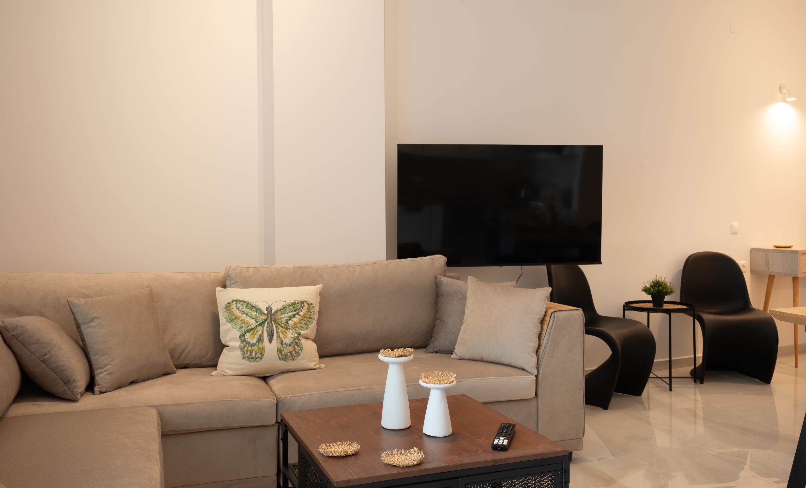 - A living room with a sofa and a TV for relaxing after a day at the beach
