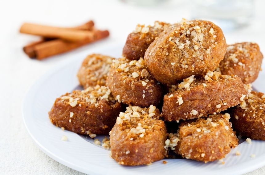 • Melomakarona – Soft honey-soaked cookies flavoured with cinnamon and cloves, topped with walnuts.